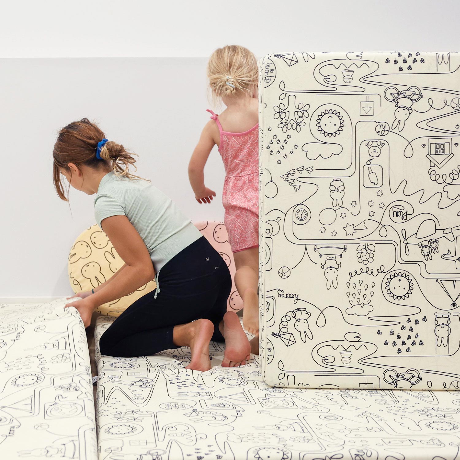 Kids playing with Miffy™ x Roo & You™ Joey Play Couch covered in bunny print.